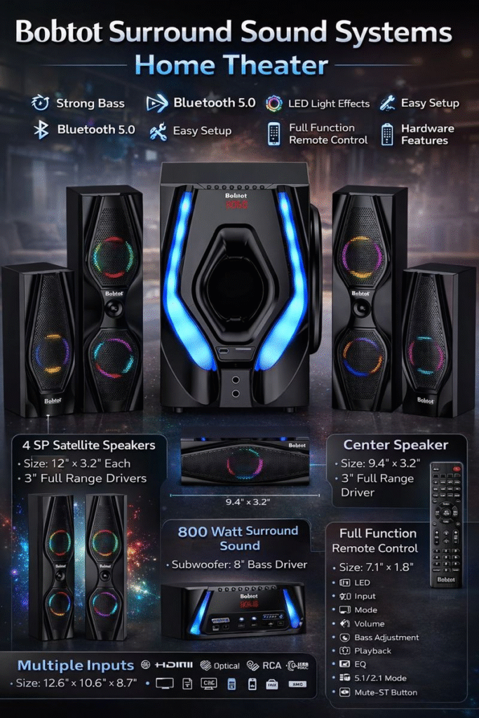 The demand for immersive home audio has grown rapidly as streaming platforms, gaming consoles, and smart TVs become central to everyday entertainment. While premium home theatre systems often come with complex setups and high price tags, Bobtot Surround Sound Systems Home Theatre positions itself as a practical alternative for users who want cinematic sound without unnecessary complications. Designed for homes, apartments, and casual entertainment spaces, this system focuses on usability, balanced performance, and flexibility.