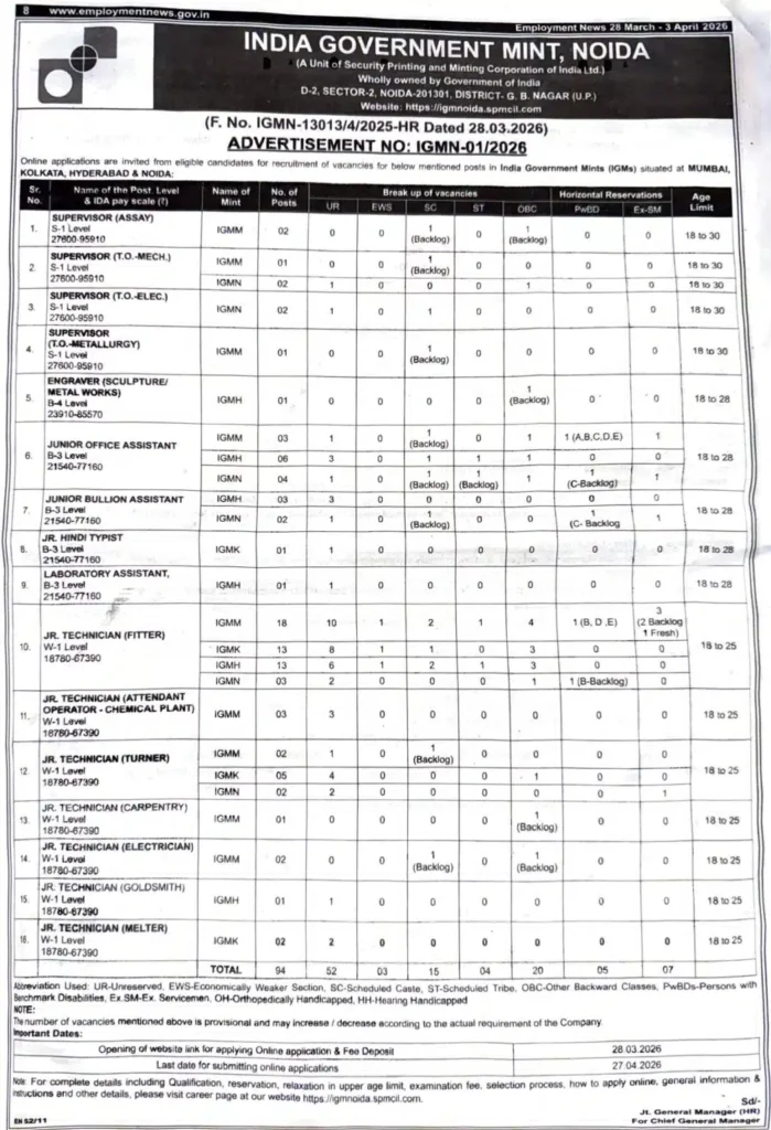 India Government Mint IGM Recruitment 2026: Apply Online for 94 Posts
