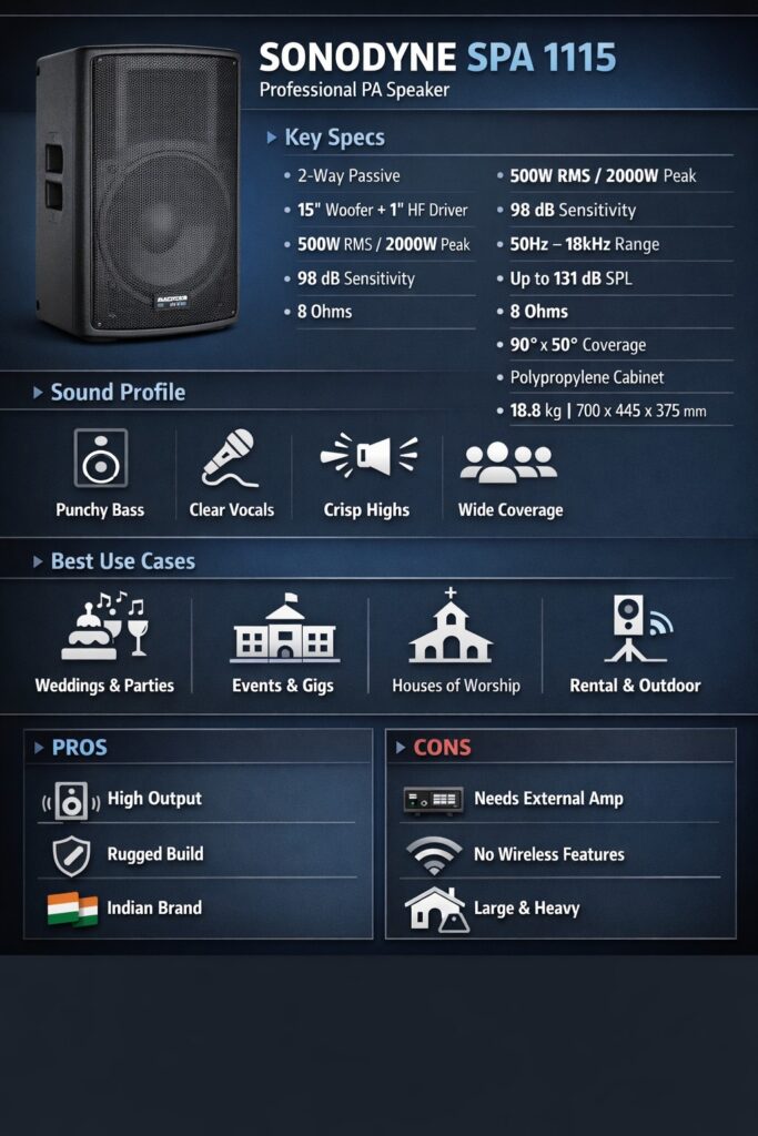 Sonodyne, as a brand, has a long history in Indian pro audio, with in‑house R&D and manufacturing in Mumbai and Kolkata, which shows in the tuning and practical design of the SPA series. The SPA 1115 is positioned as a workhorse: it can act as a main PA, side fill, or even a floor monitor, depending on how you deploy it.