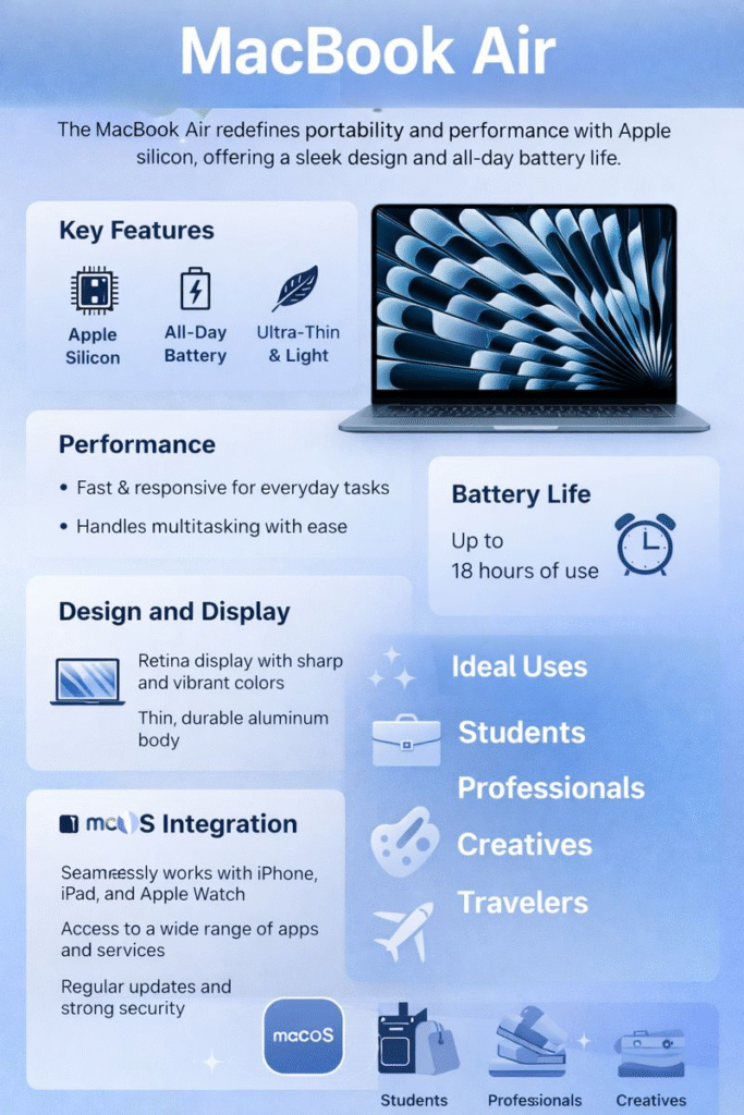 For professionals, the MacBook Air handles coding, light video editing, and design work without noticeable lag. The system remains cool and quiet thanks to its fanless design, which enhances comfort during long working hours.